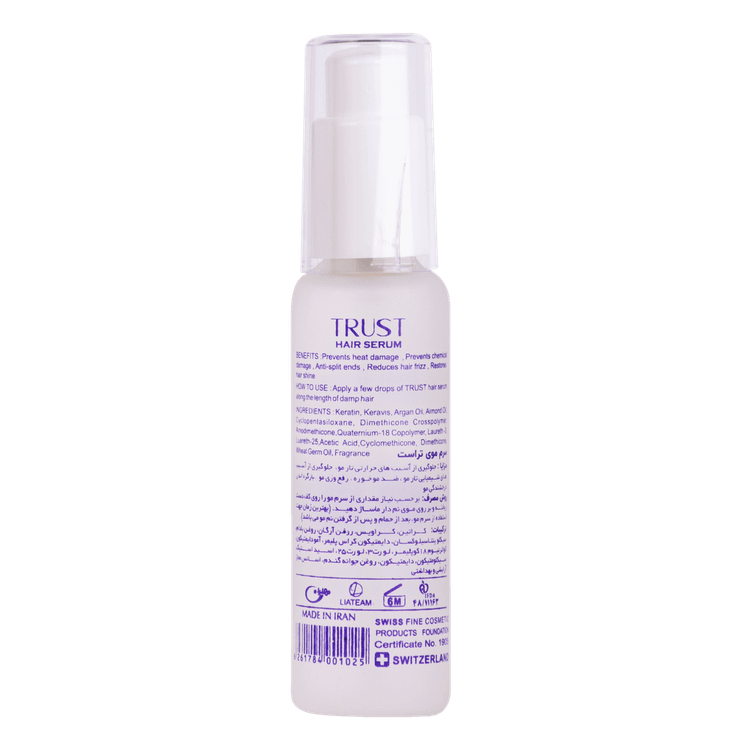 موادموثره در سرم موی تراست، روغن آرگان، کراتین، روغن بادام و جوانه گندم است.