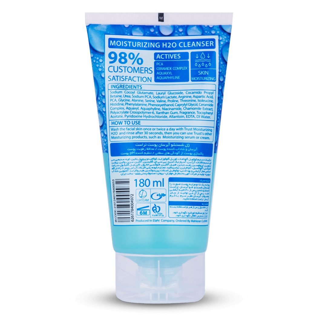 ژل شوینده آبرسان پوست تراست به خاطر داشتن ترکیبات فعال سدیم پی سی ای، زایلیتول و کمپلکس اولیگوساکاریدی موجب «حفظ رطوبت پوست» و آبرسانی مناسب سلولهای لایه اپیدرم میشود. کمپلکس سرامید این محصول، با شرکت در ساختار غشاء سلولهای پوستی به استحکام و حفظ سلولهای پوستی و «جلوگیری از ایجاد چینوچروک در پوست» کمک میکند. ترکیب آمینواسیدهای موجود در این ژل نیز به همراه ویتامین B5 باعث تغذیه سلولهای پوستی حین پاکسازی پوست میشود. این شوینده علاوه بر «پاکسازی مناسب پوست از آلودگیها»، به بهبود خشکی و تنظیم مقدار pH پوست کمک کرده و با آبرسانی سلولهای پوستی باعث حفظ استحکام پوست و جلوگیری از ایجاد لک و آکنه میشود.
