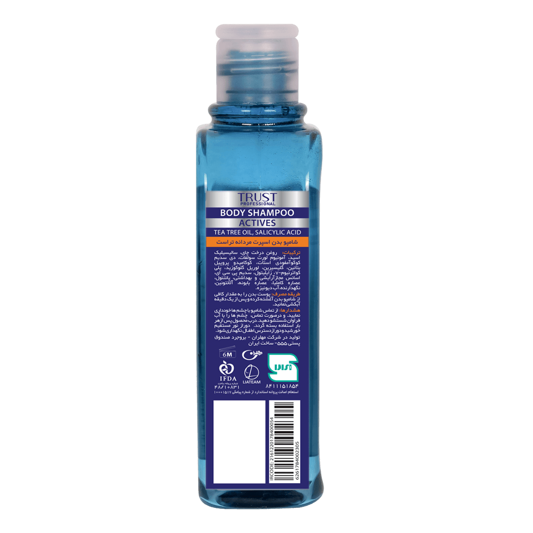شامپو بدن اسپرت مردانه تراست، حاوی منتول و زینک PCA در ساختار خود بوده و با کنترل میزان تعریق بدن، از تکثیر باکتریها روی پوست جلوگیری کرده و حس خنکی و طراوت به آن میبخشد. این محصول گزینه مناسبی برای استحمام بعد از ورزش است.