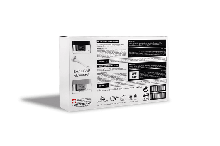 جوان کننده پوست با داشتن ترکیبات فعال پپتیدی، آمیتوز 3GA، Duraquench IQ، عصاره سلول بنیادی دانه انگور، میتوکینیل، ویوندین و کوآنزیم کیوتن افزایش استحکام پوست و رفع چین و چروکهای پوستی با داشتن ترکیبات فعال پپتیدی تتراپپتاید-۴، تتراپپتاید-۶۱، سرامید NP، هیالورونیکاسید و توکوفرول مهار کننده پرتوهای UV و روشنکننده پوست با داشتن ترکیبات فعال آمیتوز 3GA، نیاسینآمید، سیمبرایت، سیمدتوکس و میتوکینیل حاوی ترکیبات فیلتر کننده پرتوهای UV و مراقبت از پوست در برابر این پرتوها با داشتن SPF 30+ تسکیندهنده التهابات پوستی با داشتن ترکیبات فعال ویوندین، نیاسینآمید، روغن آرگان و بیزابولول مواد مؤثره کرم روز تراست اسمارت: