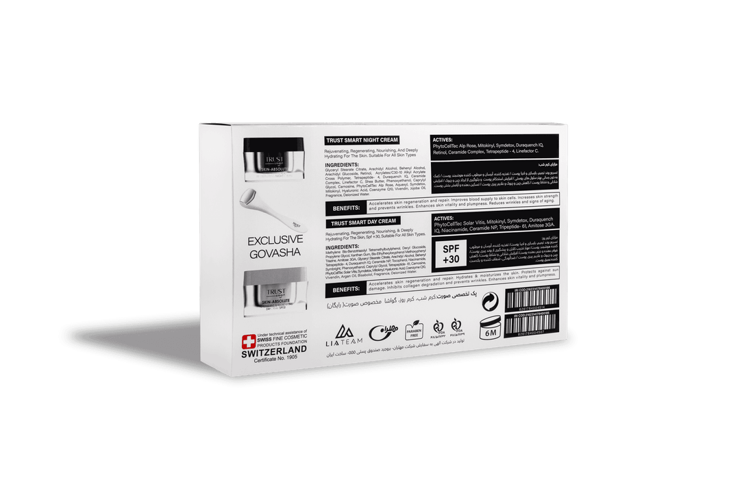 جوان کننده پوست با داشتن ترکیبات فعال پپتیدی، آمیتوز 3GA، Duraquench IQ، عصاره سلول بنیادی دانه انگور، میتوکینیل، ویوندین و کوآنزیم کیوتن افزایش استحکام پوست و رفع چین و چروکهای پوستی با داشتن ترکیبات فعال پپتیدی تتراپپتاید-۴، تتراپپتاید-۶۱، سرامید NP، هیالورونیکاسید و توکوفرول مهار کننده پرتوهای UV و روشنکننده پوست با داشتن ترکیبات فعال آمیتوز 3GA، نیاسینآمید، سیمبرایت، سیمدتوکس و میتوکینیل حاوی ترکیبات فیلتر کننده پرتوهای UV و مراقبت از پوست در برابر این پرتوها با داشتن SPF 30+ تسکیندهنده التهابات پوستی با داشتن ترکیبات فعال ویوندین، نیاسینآمید، روغن آرگان و بیزابولول مواد مؤثره کرم روز تراست اسمارت: